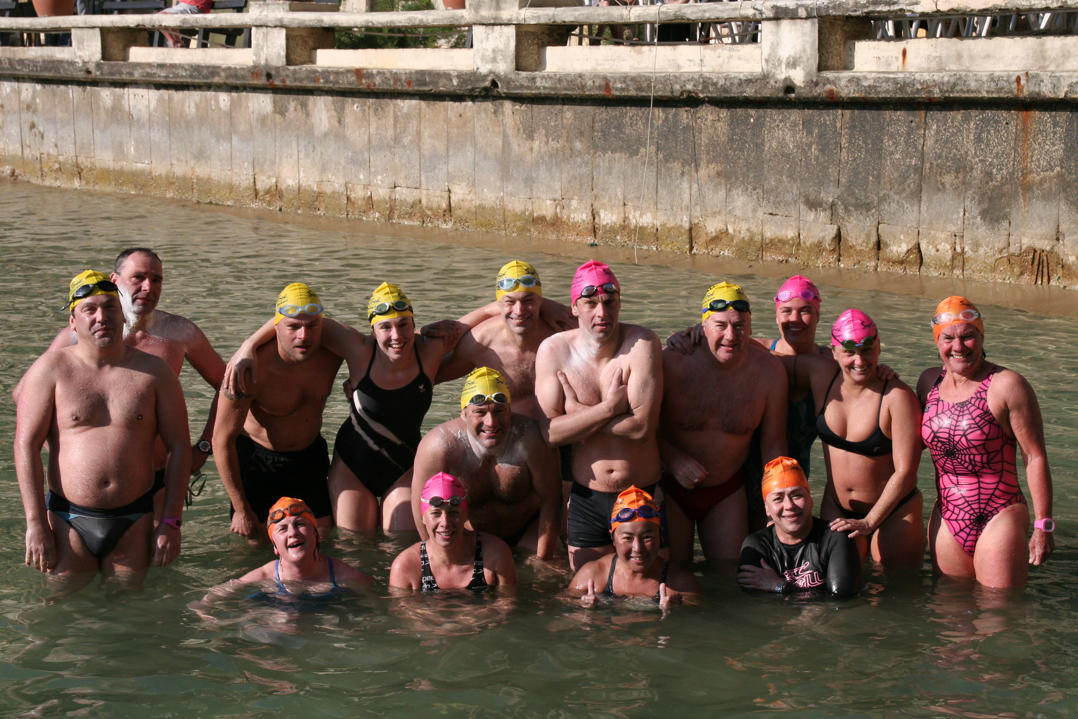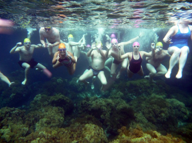 The group after the six-hour swim: Thomas, Andreas, Ian, Me, Scott (lower), Peter, Chris, Jim, Alexia, Anna, Ellery, Front: Roisin, Becky, Miyuki, Aileen.