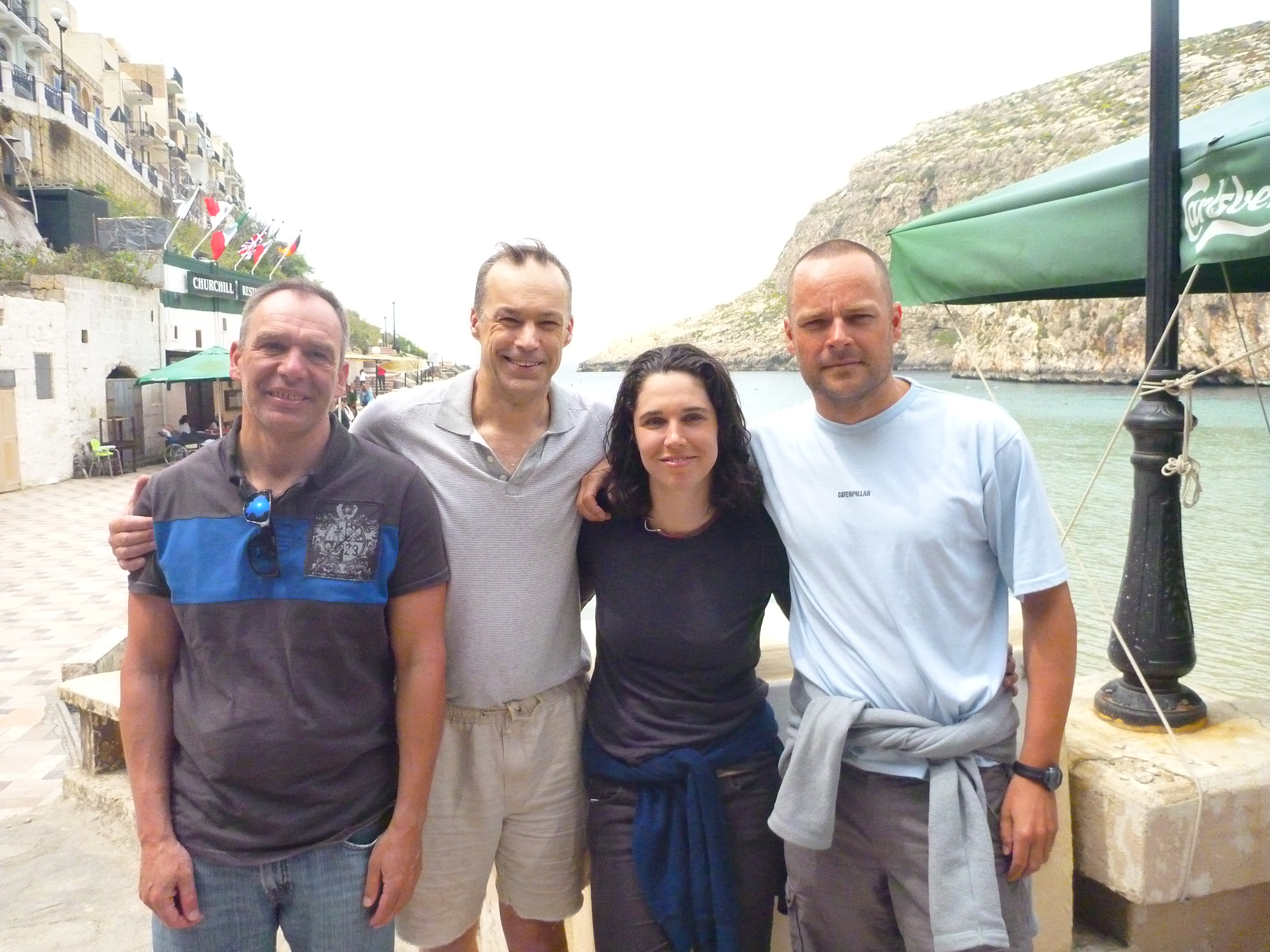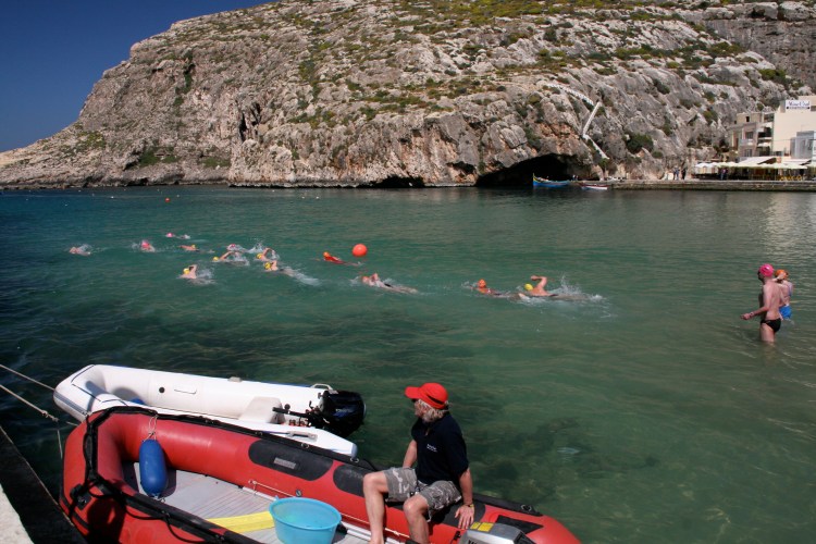 Tuesday was the only day for which the plan was not a secret. We all knew going in that Tuesday was the planned 6-hour swim. For some swimmers, this swim was a necessary “qualifying swim” to do a Channel crossing: 6 hours in 15°C water or below. Before arriving in Malta, before experiencing the punishing cold, and before wrecking my body by swimming a total of 5 ½ hours the day before, I thought 6 continuous hours sounded like challenging fun. That is, completely doable. There was no question in my mind that I would be successful in completing it. When I woke up Tuesday morning on the other hand, unable to move my arms, unable to lift my arms over my head, I realized that I would not even be able to try it. I lay in bed disappointed: arms, shoulders, and elbows all in extreme pain. It seemed like a long way to travel for just two days of swimming. But I cheered myself up with the thought of spending the day resting on shore, working on “evening out” my tan. At breakfast with friends, everyone hypothesized what they would be able to do. Alexia, and Peter, both very thin and extremely susceptible to cold, were sure that they would not make all six hours. Ian’s wrists were oddly swollen, and as he struggled to pour himself a glass of juice (it was a big pitcher), he voiced his uncertainty about going for all 6. My roommate Aileen, having woken up next to me with similarly debilitating and depressing shoulder pain was also unsure. Only Scott, both fit and sufficiently plumped-up for the occasion (he’d already put in some effort getting “channel ready” over the past 4 months) seemed confident going in.