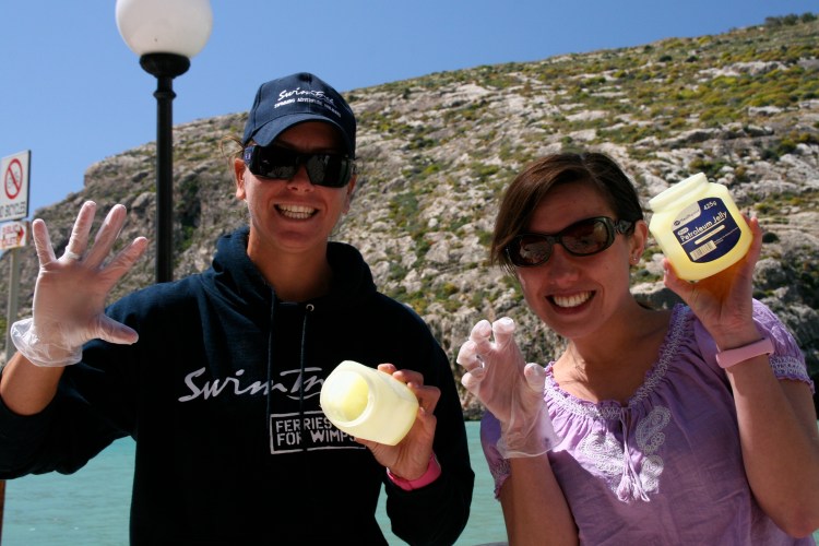 SwimTrek coaches Mia and Sakura ready to grease up swimmers before the big swim. (Wait, that's a lie. Sakura wasn't there that day. This photo is from Day 1. Same idea, though, before every swim.)