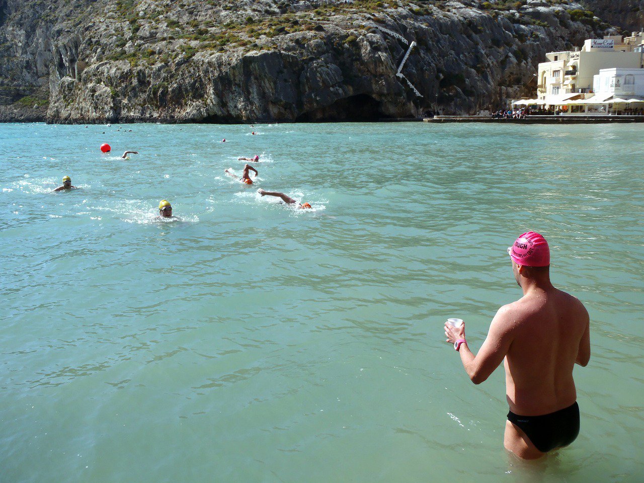 We had a brief seminar before the swim on Nick’s 4 Ps: Pee, Poo, Period, Puke. It was lovely. Then the plan for the day: We would swim out front of the hotel in Xlendi bay. To break things up, we would swim the first two hours around the normal loop. The second two hours would be loops out into the rougher water, around a giant reef, marked with a pole. The last two hours would be back around the normal loop. Also, the feed at the 5-hour mark would take place from a boat, instead of right at shore, as it would during an actual channel swim.  It all sounded great, but not applicable to me, as I would not be swimming. As everyone left the seminar to prepare for the swim, I checked in with coach Andy. I told him how I felt and asked him if yesterday’s 3½ hour swim would satisfy the 6 mile swim I needed in order to qualify for my10-mile swim in July. He said that it would. I told him that I didn’t think I could swim at all today. He said that I should just get in and see what I could do. The cold water could loosen things up. I could always get out. They would encourage me to stay in, but would understand if I had to get out. I was skeptical, to say the least.
