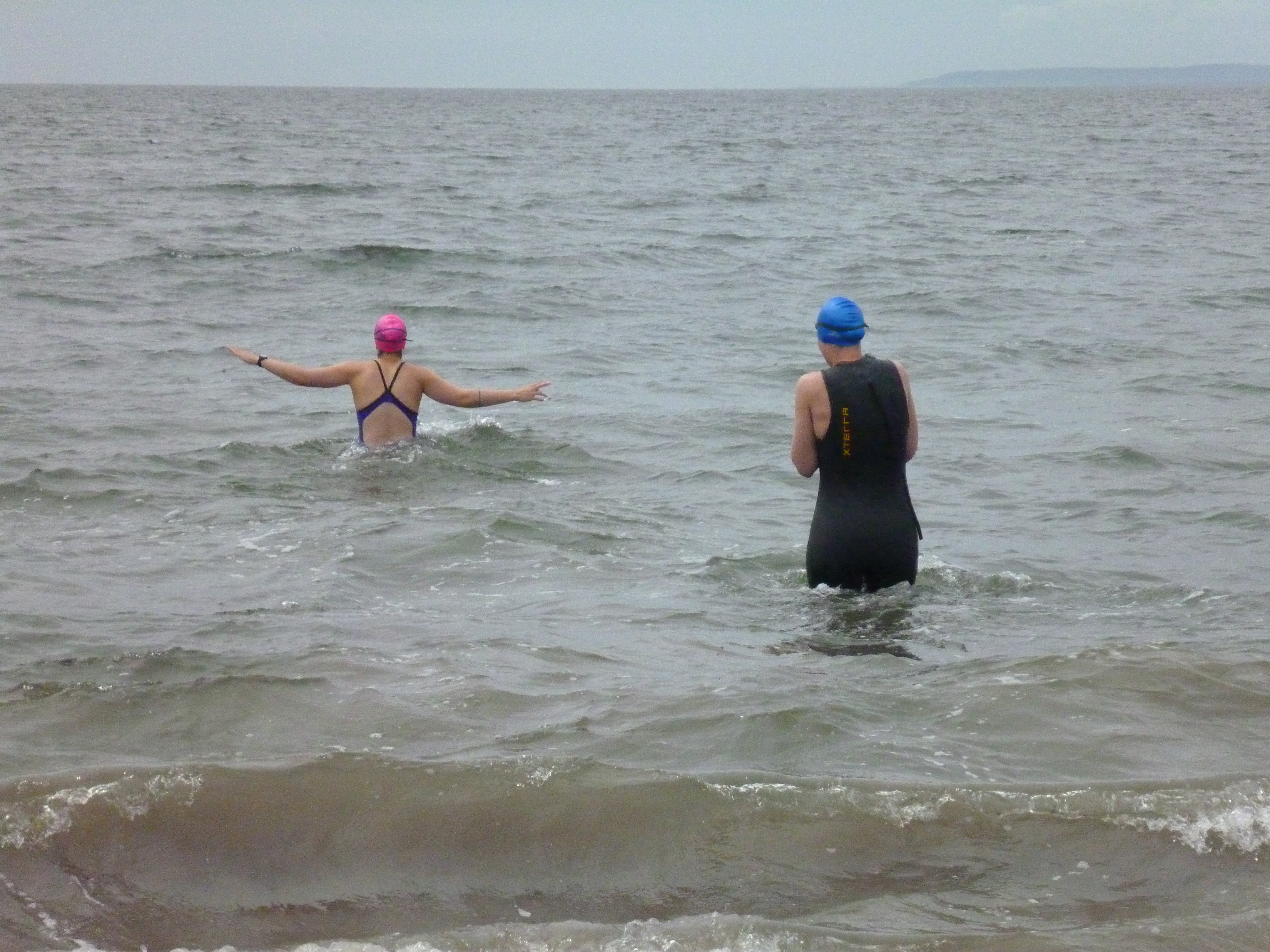 Unfortunately, my dreams of post-swim sunbathing and socializing did not materialize on this day. It was a yucky, cloud-covered, drizzly day. Standing on the beach upon arrival, chatting with the only two other CIBBOWS around, I was not even sure I wanted to get in at all. I stalled for a few minutes, hoping the weather would change. Clearly, it was not going to. Laura and I suited up and headed in.