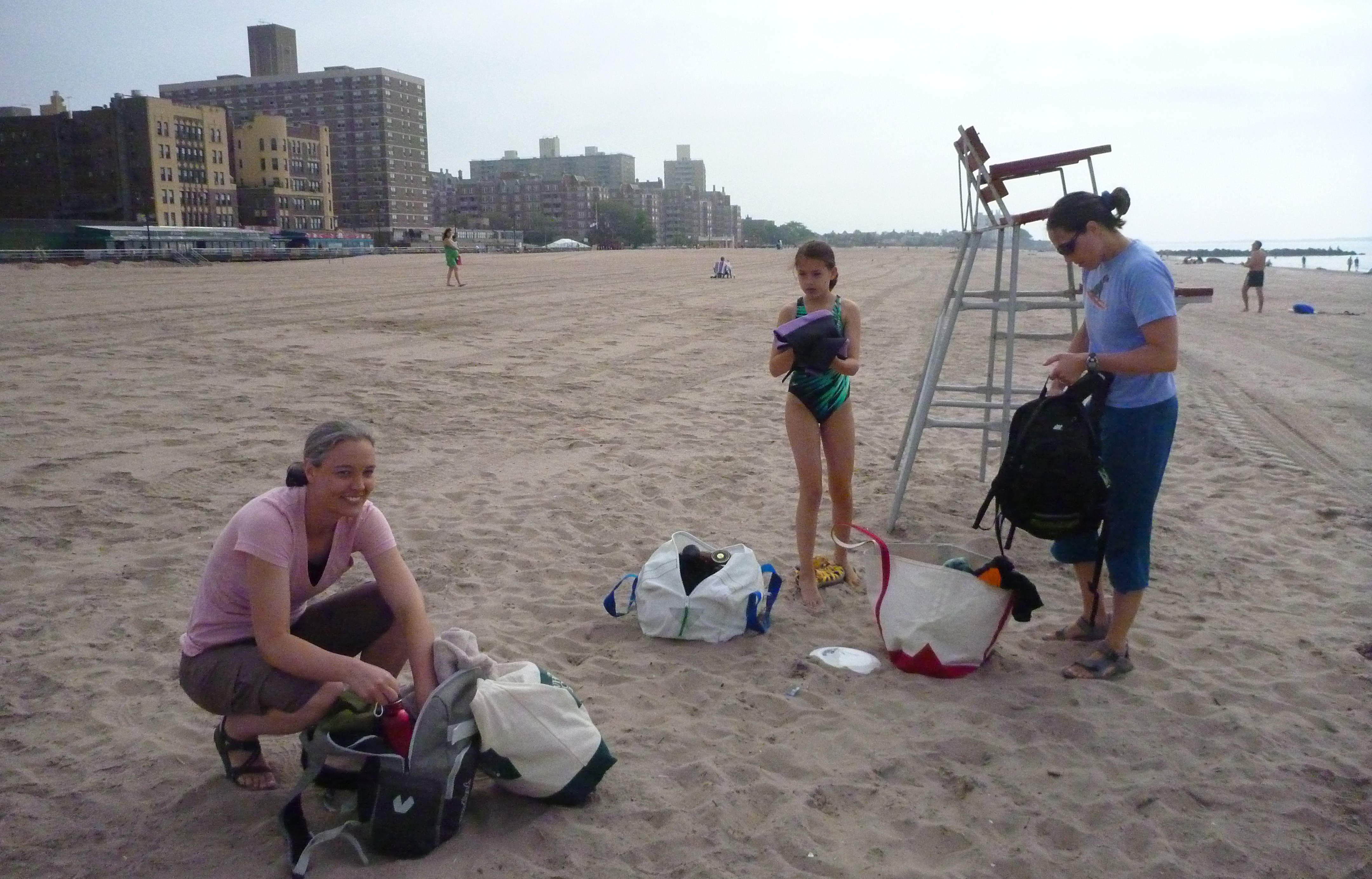 Post-swim. Unfortunately, my dreams of post-swim sunbathing and socializing did not materialize on this day. It was a yucky, cloud-covered, drizzly day.