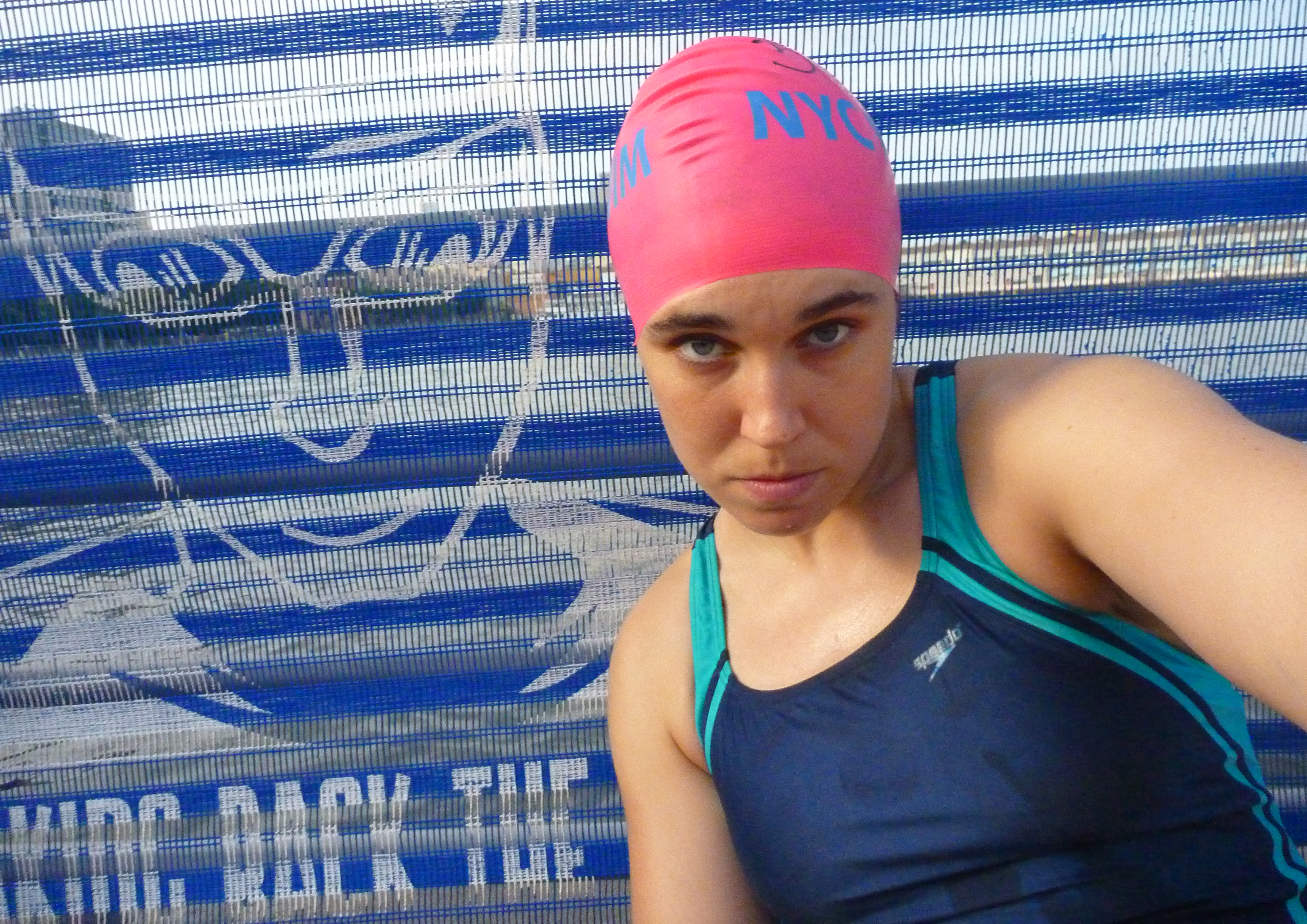 The swim itself was uneventful. It went by quickly and my stupid goggles were fogging up constantly, so I saw much less than I like to see while swimming. Upon exiting I got a metal with a picture of me on it! Well, not really. But check out the photo of me next to the NYC Swim logo on a banner. I’m kinda on it.