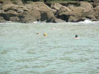 Ian, Ben, and I swim behind Scott as he approaches the rocky French shore.