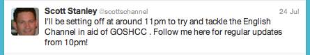 Scott’s Twitter feed. He tweeted this in the afternoon before the phone ended up in my hands. I Tweeted his progress throughout the night as he swam.