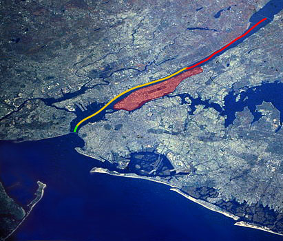 This image includes roughly the route for stage six in red, which I swam, and stage seven in yellow, for which I volunteered. Manhattan is in red, for scale.