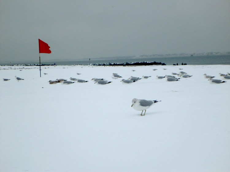 January 21st, 2012 – The seagulls at Brighton Beach brace themselves against the wind as we shed our warm layers and prepare for a swim (my first snow swim!)